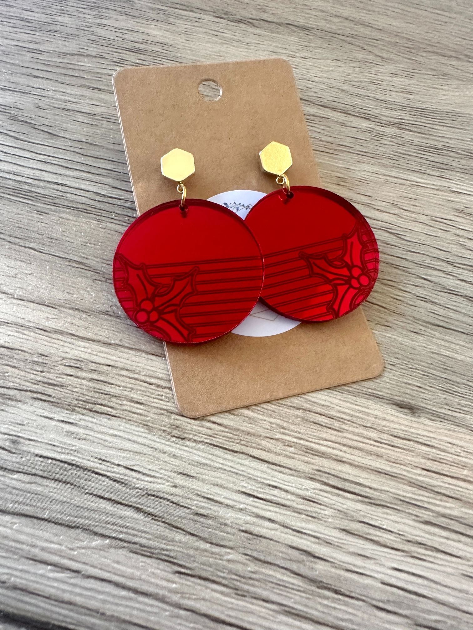 Red Mirror Mistletoe Stud Drop Circle Earrings